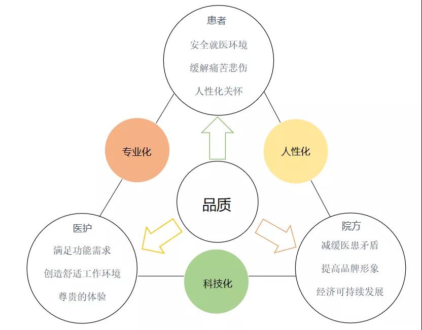 醫院的最終目的是為病人、家屬以及醫務人員提供更好的服務品質,好的醫院室內設計必須具備“四化”,即專業化、人性化、科技化和尊貴化,主要通過公共空間和科室空間兩個大的方面來設計體現。