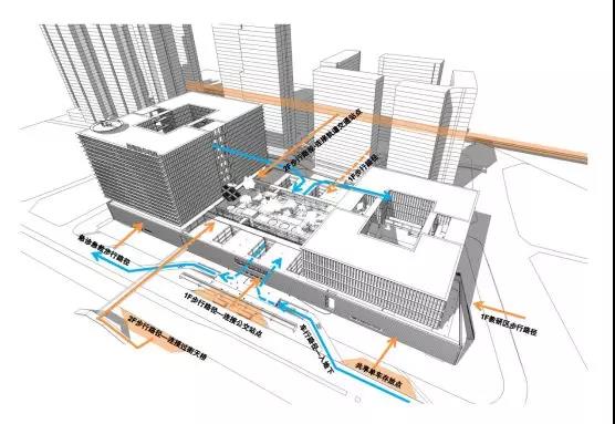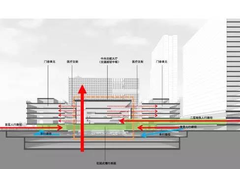 以往我們去醫(yī)院,都是去一個正門大廳,然后從大廳再去各個科室,這往往讓大廳成為人流的瓶頸。而在新華醫(yī)院,預計每天人流量有4萬人,因此把醫(yī)院打造成從四面八方都能進入的場所。