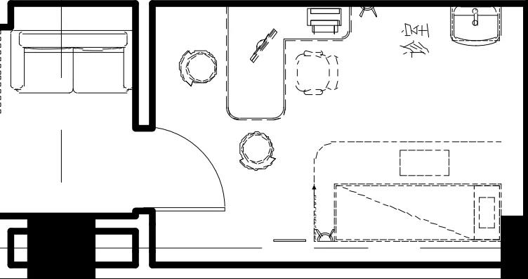 建議進(jìn)行標(biāo)準(zhǔn)化布置,以滿足基本診療的需求。向內(nèi)平開門并靠深側(cè)墻,門方向深側(cè)墻對側(cè)設(shè)置診桌,診桌后方同側(cè)墻距離1米以外處布置洗手盆,防止水外濺腐蝕診桌。建議使用感應(yīng)式水龍頭設(shè)置,洗手盆下水管做U型彎方便檢修,洗手盆下做美觀的裝飾柜。水池上方30-50厘米以上貼墻梳妝鏡,保證門診醫(yī)生以良好的形象服務(wù)患者。檢查診床設(shè)置在洗手盆對側(cè)深側(cè)貼墻擺放,婦產(chǎn)科、耳鼻喉科、眼科等檢查床(椅)設(shè)備可布置在同側(cè),朝向可根據(jù)醫(yī)生診療習(xí)慣布置。檢查床必須設(shè)置隔簾,保護(hù)隱私。空調(diào)出風(fēng)口宜設(shè)置在診室門上,且側(cè)送風(fēng)為最佳,可避免直吹醫(yī)生或患者,且保證室內(nèi)空氣循環(huán)。