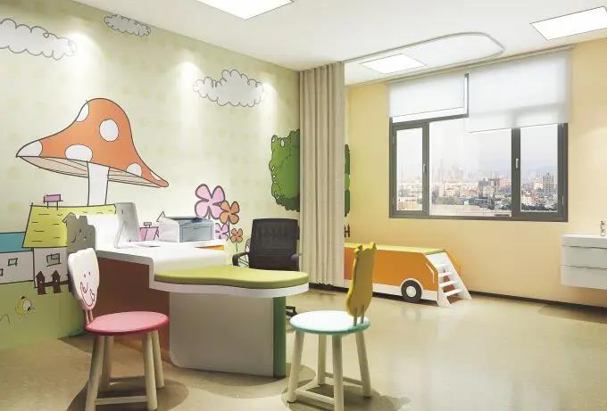 兒科可不設(shè)置二次候診區(qū),但建議在公共候診區(qū)設(shè)置符合院感和安全要求的小型休閑游樂場;裝修涂料建材要求綠色環(huán)保,樣式以“卡通”人物或場景為主;診床和家具必須做圓弧處理或加防撞安全保護(hù),診床可選用玩具型家具床;可選擇不設(shè)置隔簾,減少兒童密閉恐懼感。