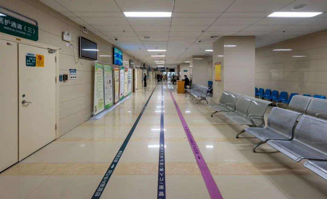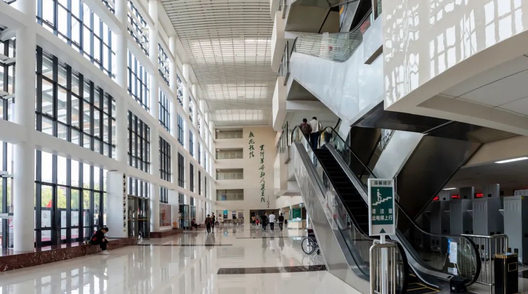室內(nèi)的水平通道、垂直通道要從功能的分布、各醫(yī)療流程進行梳理整合,選擇各種運輸梯臺數(shù)量與形式,從而提高醫(yī)院的整體運營效率。圖為上海市第六人民醫(yī)院門診醫(yī)技樓垂直電梯廳。