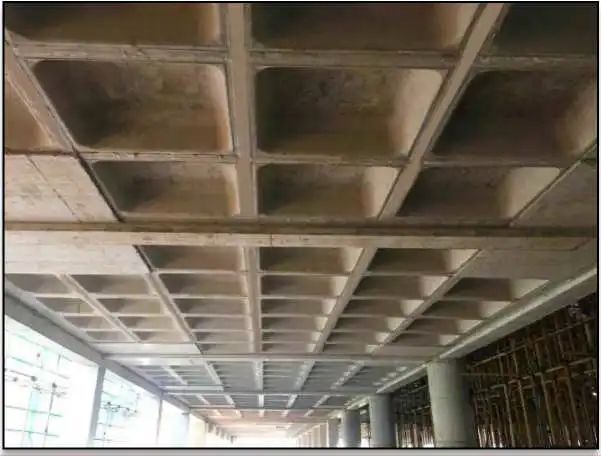 主體結(jié)構(gòu)內(nèi)堅外美,梁柱節(jié)點棱角清晰。本工程在管線集中的公共區(qū)域,在結(jié)構(gòu)設(shè)計階段就提前考慮了降低主體成本和空間優(yōu)化在醫(yī)療街部位首次采用了9500m2雙向密肋梁樓蓋板,采用成品塑料模殼作為胎模,有效減少了樓板的混凝土量與樓板自重;增加室內(nèi)凈咼與柱網(wǎng)跨度,在標(biāo)準(zhǔn)層咼范圍提咼了各專業(yè)吊頂內(nèi)施 工空間,整體性能好、剛度大、抗震性能好;同時還起到隔聲、隔熱的作用,以不增加造價和實用性為選用原則。