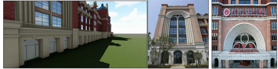 外立面采用正統(tǒng)的英式古典復(fù)興風(fēng)格,造型復(fù)雜,由石材、軟瓷、仿石鋁板、 GRC構(gòu)件、西式陶瓦等多種材料拼接和結(jié)合,多種材料交替使用,界面清晰,線條順直, 曲線圓滑;西式陶瓦、坡屋面、幕墻等建筑手法的巧妙運用,賦予建筑獨特的韻律和美感。