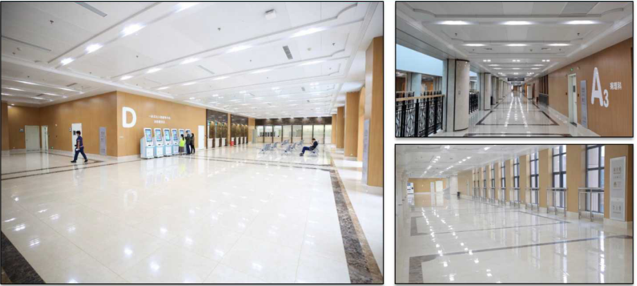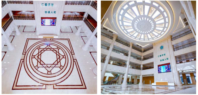 門診大廳采用多層圓形GRG吊頂,質(zhì)量輕、不變形、安全性好、防潮、防火、阻燃性能好,屬綠色環(huán)保材料類,造型豐富,聲學(xué)效果好,加工周期短,施工便捷、品質(zhì)穩(wěn)定,裝飾效 果凸顯大氣,整體風(fēng)格協(xié)調(diào),與地面拼花上下對中,天地相應(yīng)。
