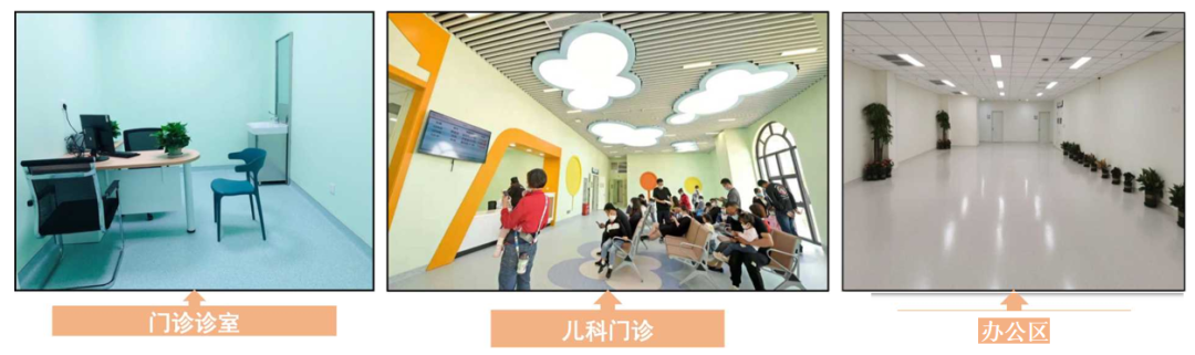 兒科區(qū)域天空、地面云朵、墻面城堡卡通造型設(shè)計,烤漆板,鋁方通、地膠、玻纖壁布搭配,效果溫馨,不同材料色彩運用,盡顯人性化設(shè)計。診室、辦公區(qū)墻地面裝飾簡潔明亮,干凈舒宜,地面PVC地膠,墻面玻纖壁布,耐磨耐用,抗污效果好,容易清潔,質(zhì)感柔和,色彩豐富,選擇面廣。