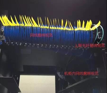 內(nèi)網(wǎng)接入交換機(jī)布放的線纜通過理線器整理,在理線器上每4根網(wǎng)線用扎帶做捆綁,每一根網(wǎng)線上標(biāo)有唯一的一個(gè)標(biāo)簽,另一端放到機(jī)架內(nèi)托盤位置。光纖下放長度無須太長,彎曲度不能太大,貼好標(biāo)簽且上聯(lián)到不同核心的光纖應(yīng)盡量用不同顏色的標(biāo)簽來區(qū)分。