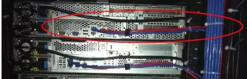 不同線纜用不同顏色的線區(qū)分,如內(nèi)網(wǎng)線:藍(lán)色,ILO線:灰色,電源線:黑色,預(yù)留的線纜長度不宜過長,能從一側(cè)PDU到另外一側(cè)PDU即可,預(yù)留過長線纜會(huì)對(duì)理線造成影響。上下兩臺(tái)服務(wù)器之間布線及捆綁要求如下圖:(因網(wǎng)線有電磁干擾,要做到強(qiáng)弱分開,電源線與網(wǎng)線要分開捆扎)